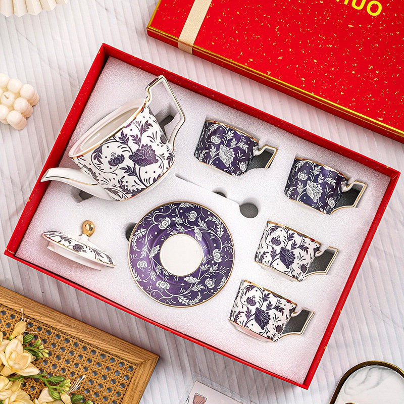 British Traditional Afternoon Tea Cup Set of 4 cups, 8 oz Ceramic Coffee Cup with Saucer in Gift Box, Porcelain Tea Cup and Saucer Set with Teapot