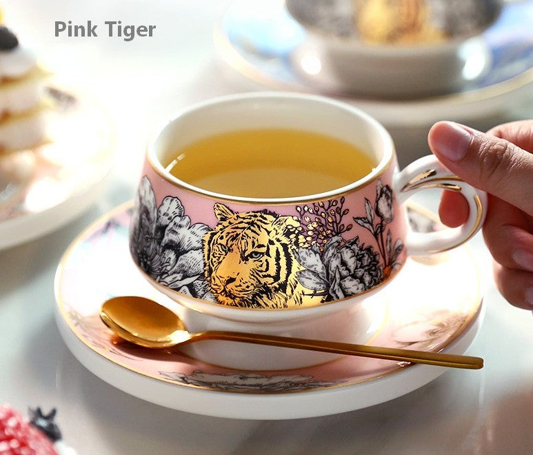 Creative Ceramic Tea Cups and Saucers, Jungle Tiger Cheetah Porcelain Coffee Cups, Unique Ceramic Cups with Gold Trim and Gift Box
