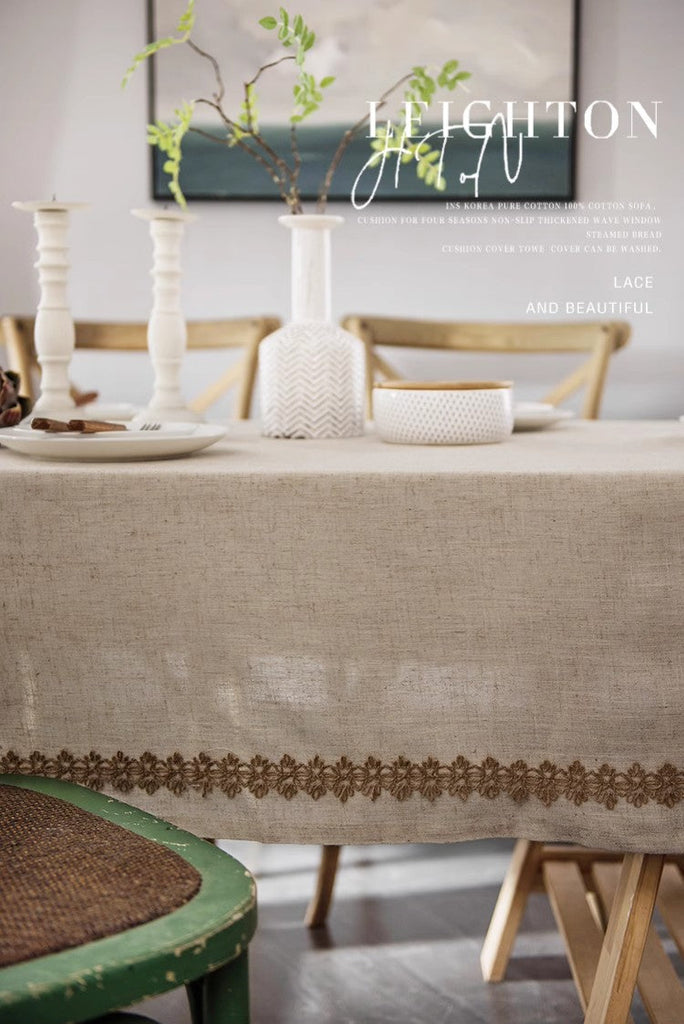 This unique natural flax table cloth is suitable for dining table, tea table, piano cover, bedstand, etc.