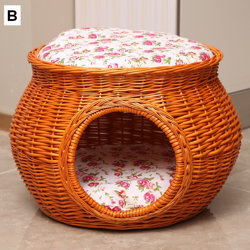 Wicker Cat House Basket with Washable Cushion for Indoor Cats and Dogs, Rattan Cat Bed